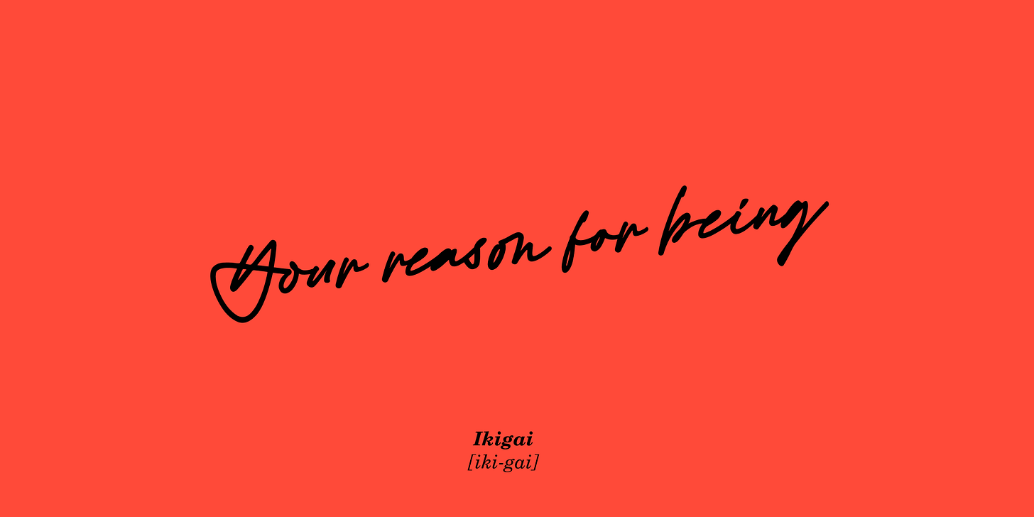 Originally a Japanese concept, ikigai is often described as something like “your reason for being” or “your reason to get out of bed in the morning”.